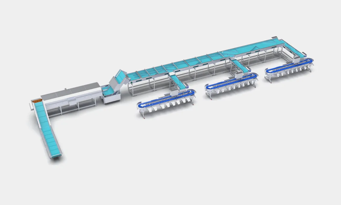 As products move along the grader, individual pieces are dropped into specific chutes or trays corresponding to their weight or grade.
